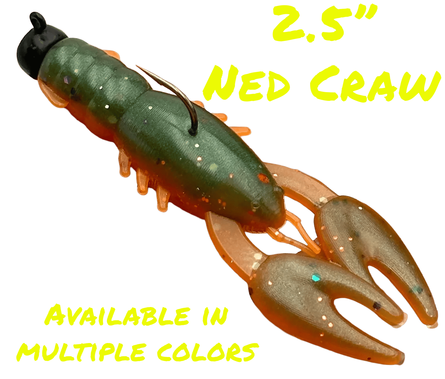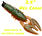The 2.5 Inch Ned Craw bait measures 2.5" from tail to tip of claws. Featuring 3D claws, short ned rig style body, 6 legs, and small antenna. Designed for ned rigs and small jigs.